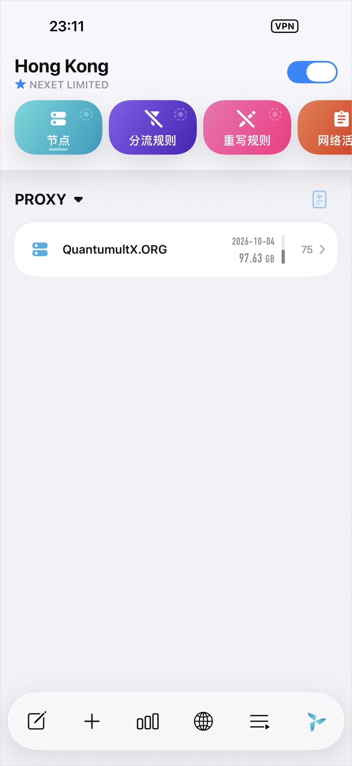 Quantumult X是iOS及macOS平台下一款网络代理软件客户端,同时支持Apple TV系统,支持翻墙协议有Shadowsocks (SS)、ShadowsocksR (SSR)、Trojan、V2Ray等科学上网协议。
