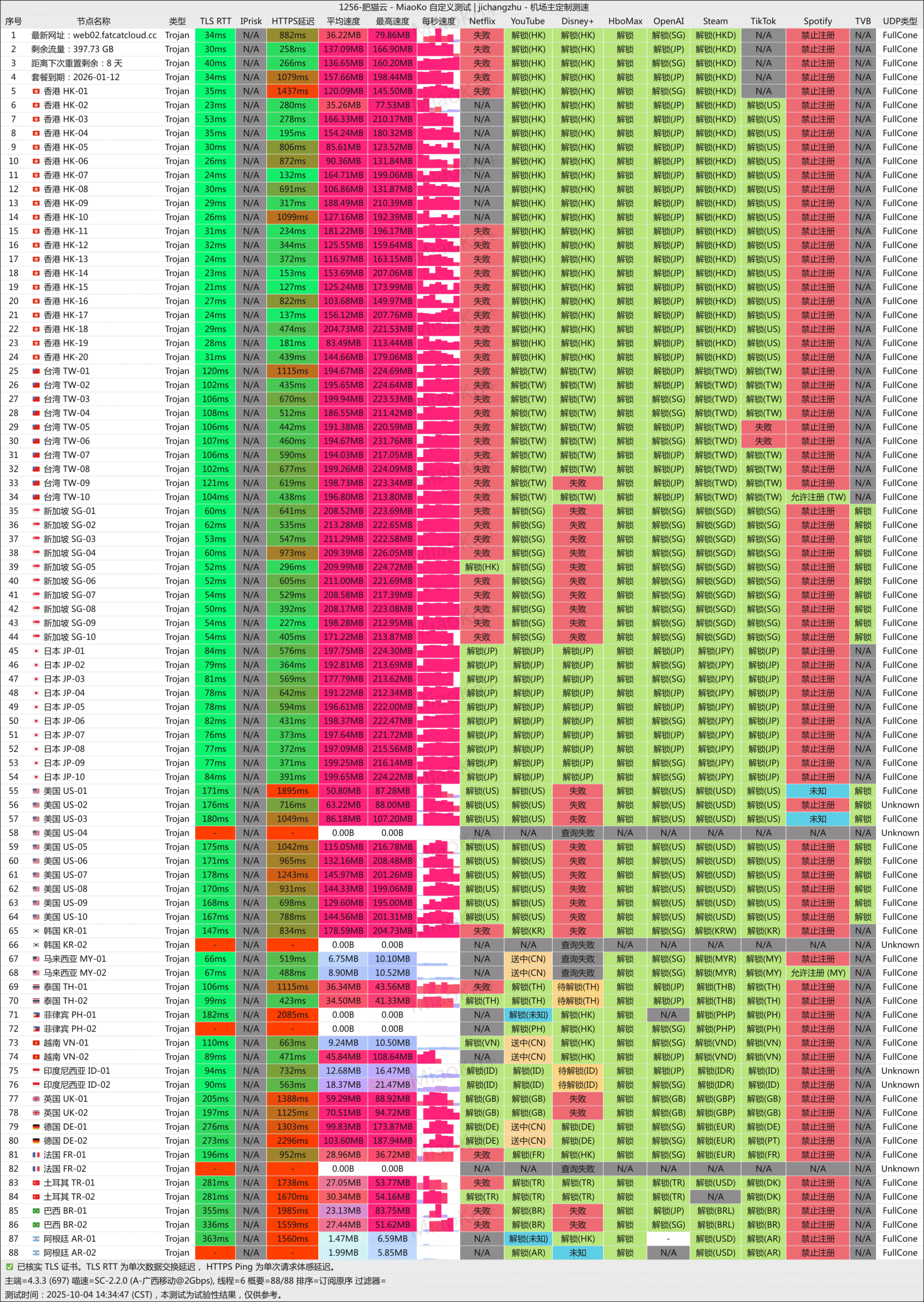 • 节点速度:注意 MB 和 Mbps 之间的转换,一般我们说的千兆家宽 1000M,就是 1000Mbps 即 1Gbps,转换成日常的带宽速度,也就是 125Mb/​s 。一般家宽会给到部分冗余,实际测出来很多家宽会超过固定的速度。对大部分人而言,速度,跑满本地带宽的都是「伪需求」,一般节点多次测速下来,速度超过 50Mbps 或 6.25MB ,就已经可以满足观影需求了。所以单次的测速,其实参考价值不高。