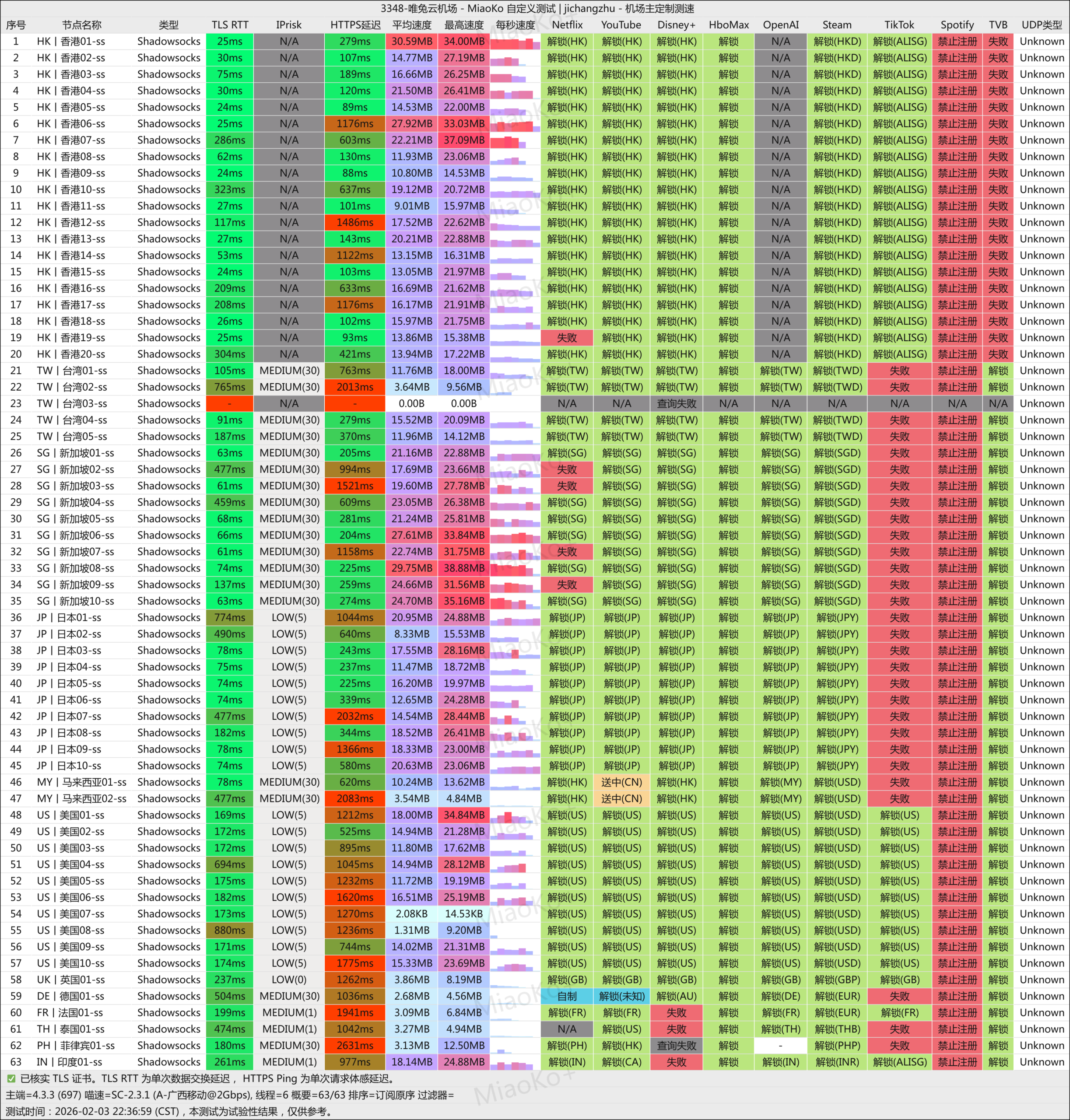 • 节点速度:注意 MB 和 Mbps 之间的转换,一般我们说的千兆家宽 1000M,就是 1000Mbps 即 1Gbps,转换成日常的带宽速度,也就是 125Mb/​s 。一般家宽会给到部分冗余,实际测出来很多家宽会超过固定的速度。对大部分人而言,速度,跑满本地带宽的都是「伪需求」,一般节点多次测速下来,速度超过 50Mbps 或 6.25MB ,就已经可以满足观影需求了。所以单次的测速,其实参考价值不高。